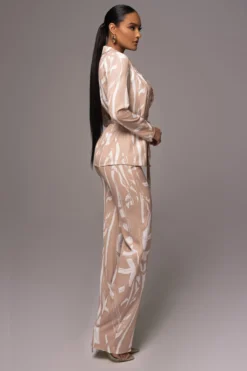 Stay suited for paradise in our Beige Frida Print Pant Set. Crafted from lightweight fabric, this captivating two piece pant set is enriched by a soft printed pattern perfect for the season. Featuring a lovely blazer with notch lapels and a matching waist-tie belt. The matching pants come with back zipper closure and straight leg hems that create a tasteful and sharp look. Sold as set. Minimal stretch.