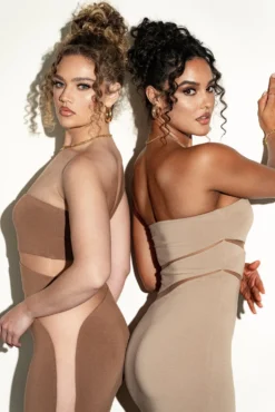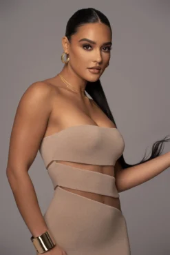 Bring sheer elegance to your next special occasion in our new Beige Unpredictable Dress. This fitted midi-dress features a strapless neckline with alluring sheer panels in asymmetric patterns creating the illusion of stylish cutouts. Crafted in our double-lined fabrication achieving an effortlessly sculpted fit with ultimate appeal. Stretchy.