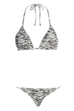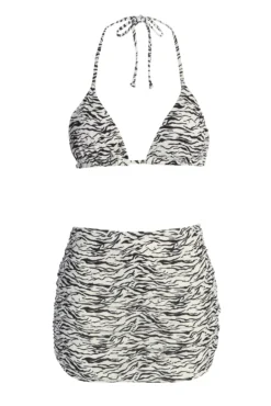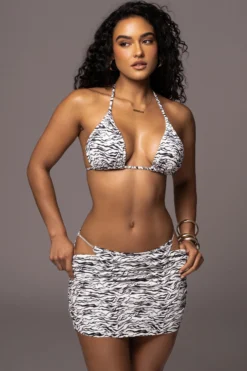 Go bold this Summer in the new Black Arie Zebra Print Bikini Set. This timelessly stylish 3-piece bikini set features an elegant black and white zebra print with a triangle style bikini top, cheeky cut bikini bottoms, and a stylish cover up skirt to complete the look. Crafted in an ultra stretchy material, this bikini set provides both style and comfort. Stretchy. Sold as set.