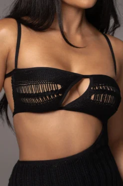 City meets coastal style in our new Black Coastal Escape Dress. Crafted in a crochet knit fabric, this sleek midi dress features a square neckline with adjustable shoulder straps and two back straps with adjustable fastening. A cut at the chest and waist adds a touch of allure. Double lined. Stretchy.