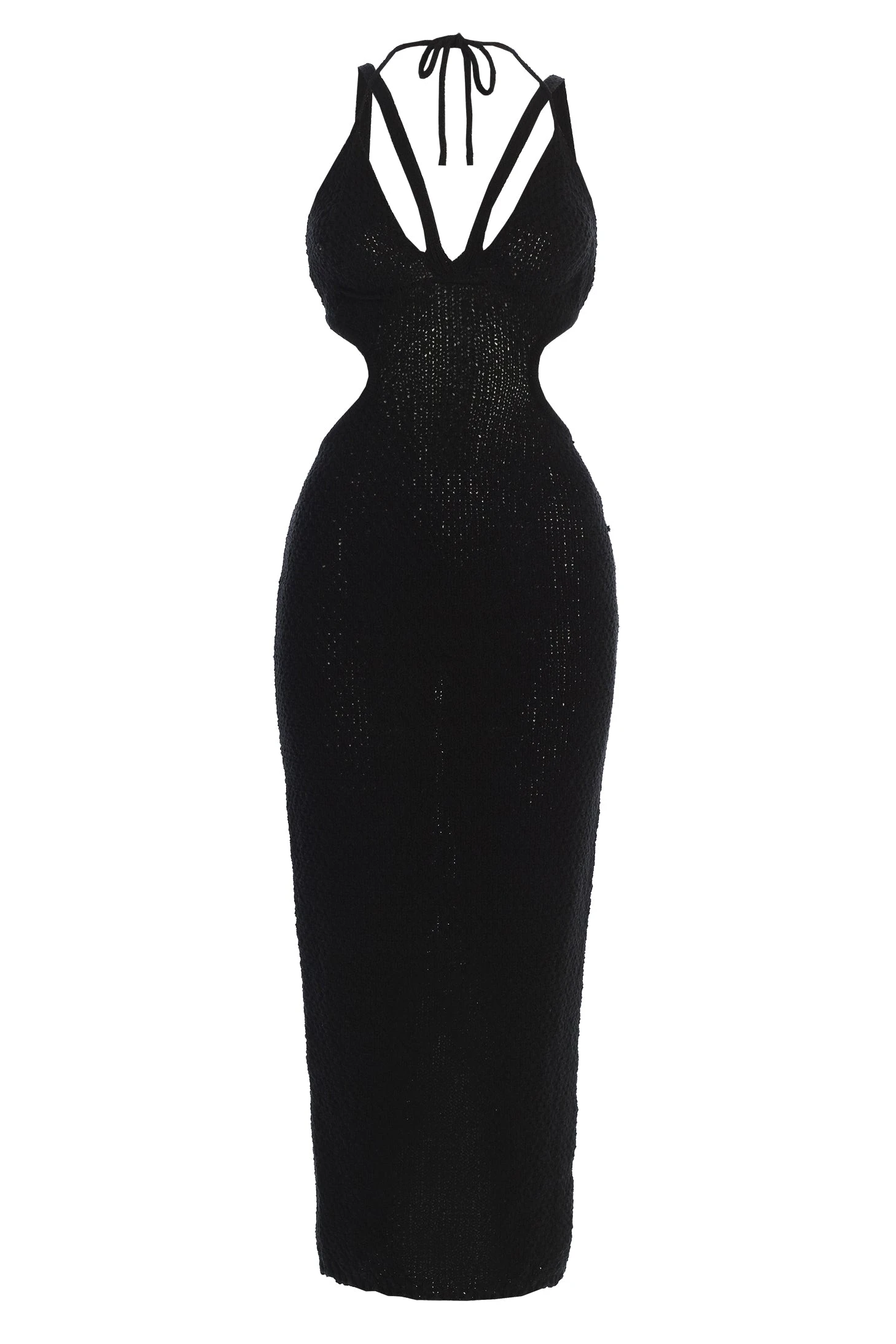 Explore new waters in our Black Serenity Cutout Midi Dress. Crafted in soft crochet knit, this fitted midi dress features a halter neckline with neck tie closures, stylish front straps, and waist cutouts. Stretchy.