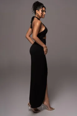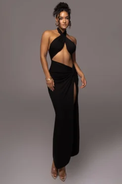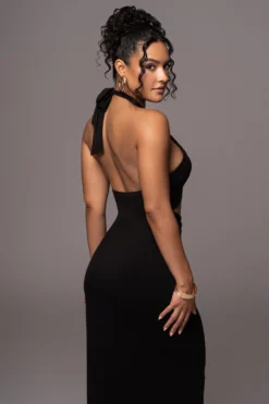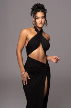 Channel the goddess within in our Black Tamara Halter Midi Dress. Our newest addition boasts a captivating crossover halter design, complimented by a waist cutout and a striking side slit featuring a knotted detail for added flair. Expertly crafted from soft, double-lined fabric with stretch for a flexible fit. Stretchy. Double lined.
