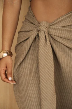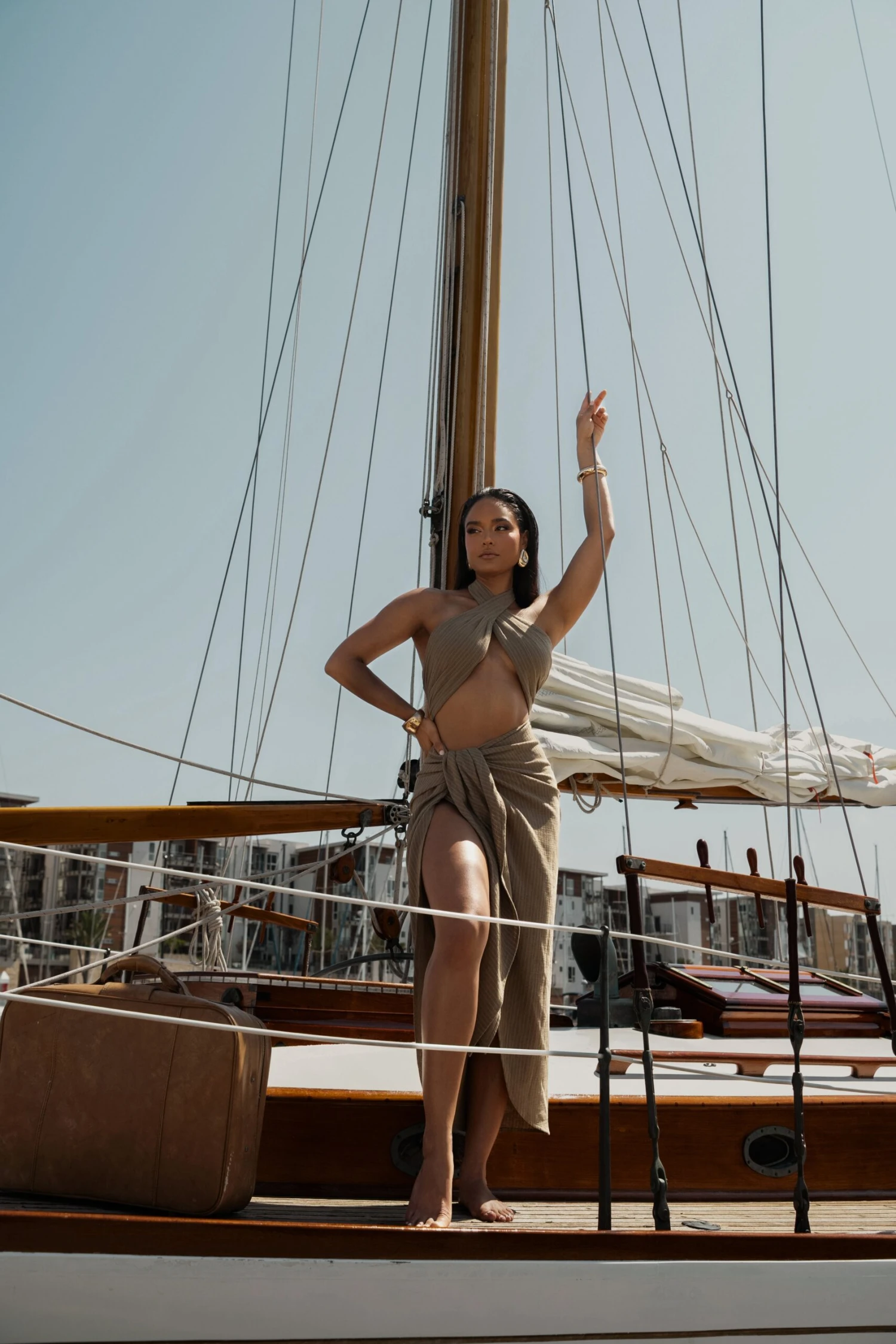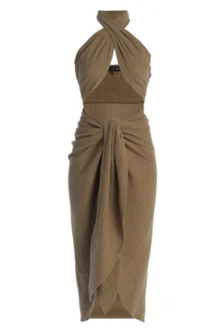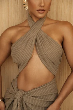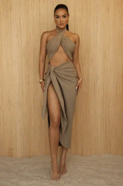 Channel the goddess in you with our Brown Linen Sahara Dress. This appealing drape design features a crossover halter-neck with center cutout and a captivating side slit with wrap front ties draping down the middle. Designed in double lined linen fabric with a smocked back for a flexible fit. Some stretch.