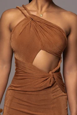 Turn heads in our stylish Brown Scarlet One Shoulder Maxi Dress! Highlighting a sleek one shoulder neckline, this stunning occasion dress details an eye-catching thigh slit with a cutout waist, back zipper closure, and maxi length hem. Crafted in a luxe slinky fabric for premium quality and comfort. Double lined. Stretchy.
