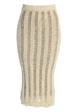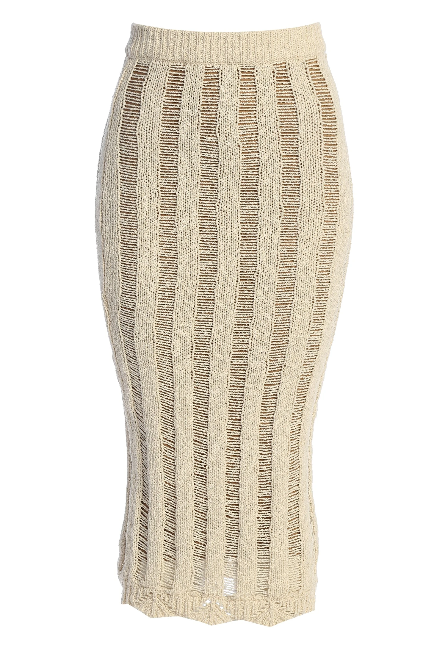 Luxuriate under the sun with our Buttercream Good Form Midi Skirt. This pencil silhouette midi skirt is featured in a distressed crochet fabric with an elastic waistband and beige lining interior. Stretchy.