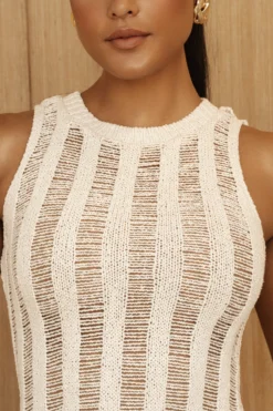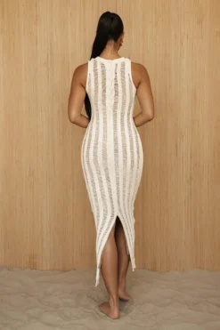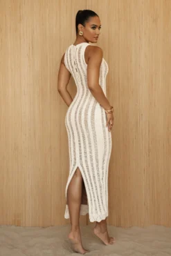 Add seaside allure to your getaway with our Buttercream Take It Away Crochet Maxi Dress. Crafted in a distressed crochet material, our newest maxi dress highlights a high neckline, a fitted silhouette, and interior lining that creates a seamless nude illusion from head to toe. A button back closure with back slit hem add a finishing touch. Stretchy.