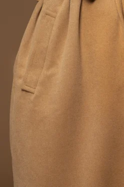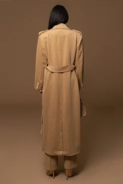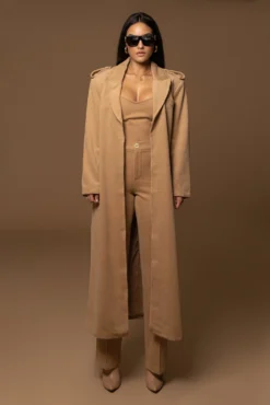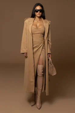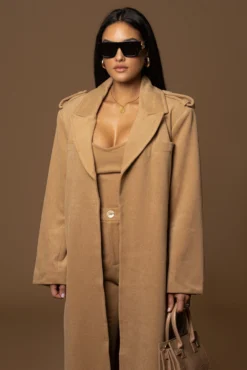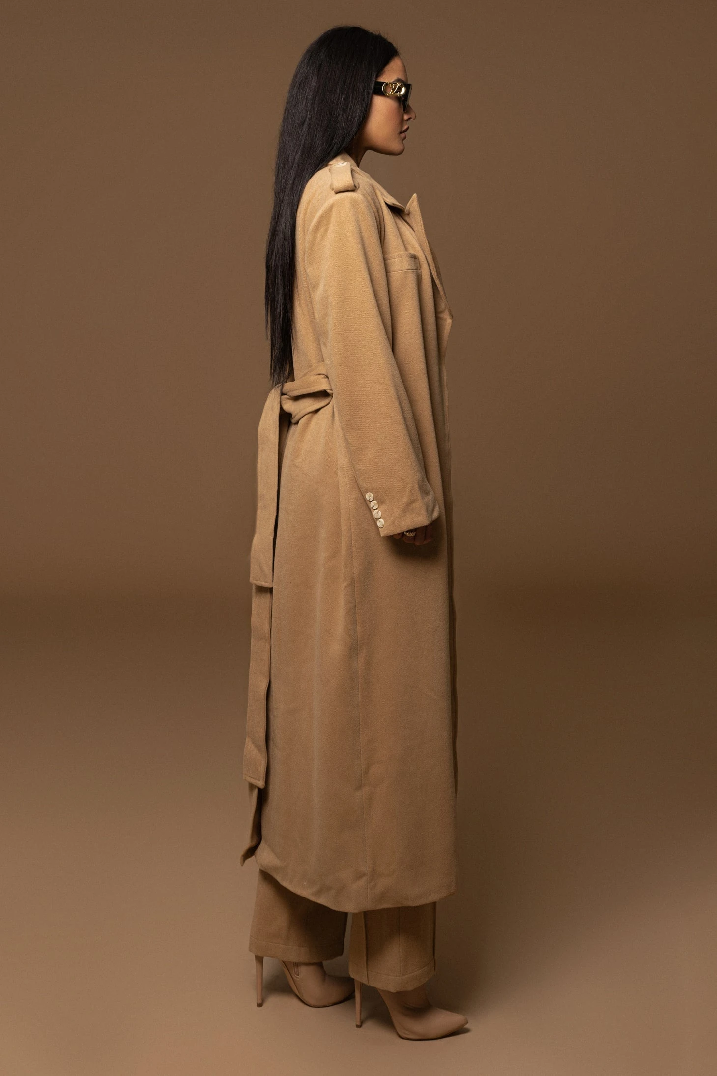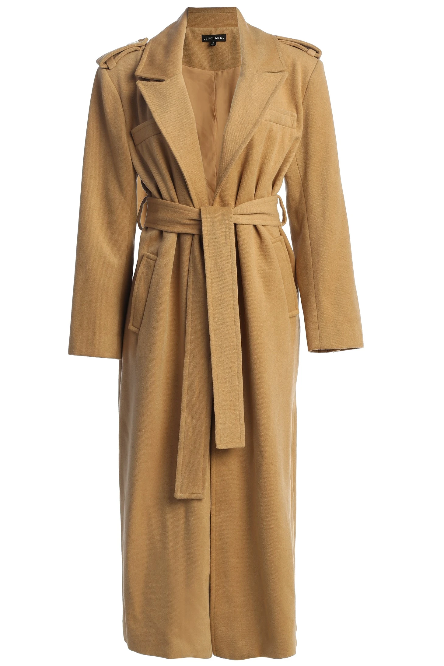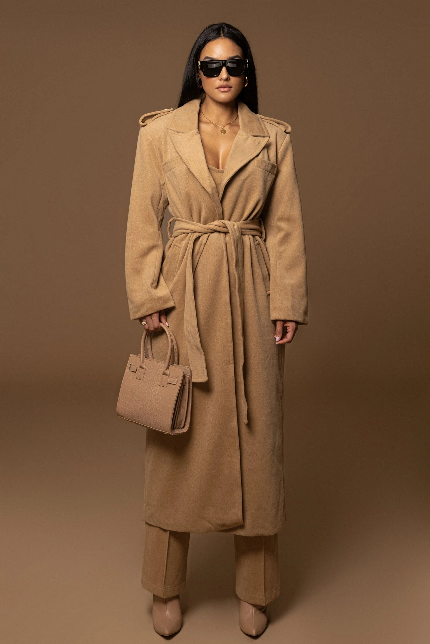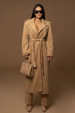 Stay warm and in style with our Camel Savannah Belted Wool Coat. This sophisticated long-line coat showcases a collared neck with notch lapels, two functional side pockets, two faux bust pockets, and a matching waist-belt to cinch it all together! Button tab shoulders with a back slit hem add a finishing touch. Pair with our