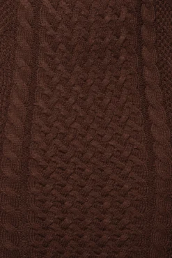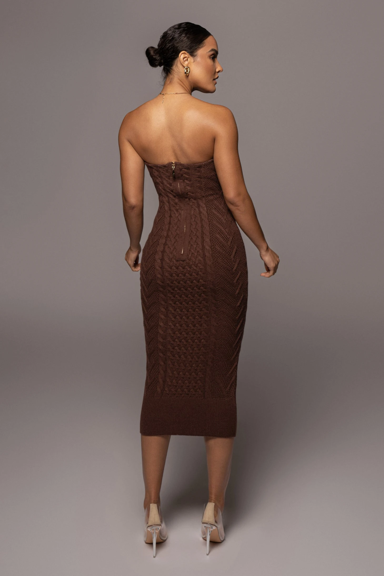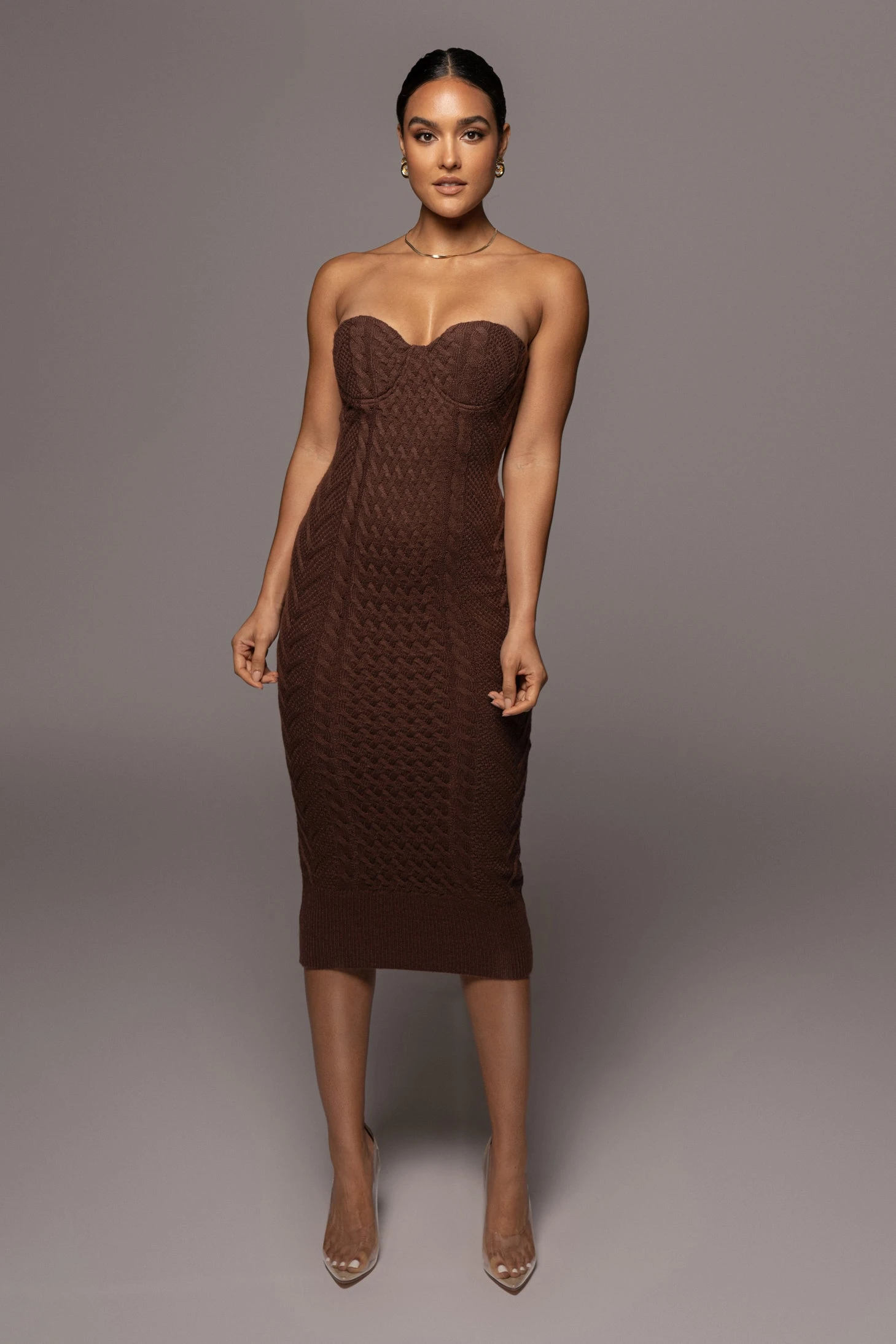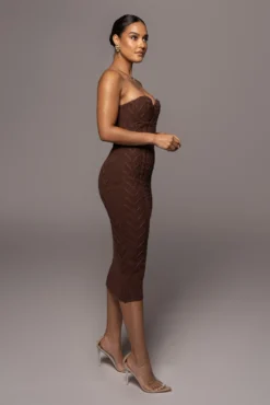 EXCLUSIVELY DESIGNED BY US FOR YOU. Set the tone in our CHOCOLATE SHADES OF YOU BUSTIER DRESS for outerwear that captivates! This strapless bustier dress is featured in an all over cable knit material with a sweetheart neckline, wired cups with padding, and a fitted silhouette that leads down to a ribbed midi hem. Complete with grip silicone gel at the bust for a secure hold. Gold tone back zipper for closure. Stretchy.