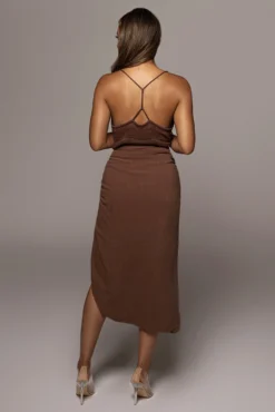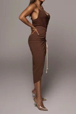 EXCLUSIVELY DESIGNED BY US FOR YOU. Head to your sunny destination with our CHOCOLATE SPRING RUCHED LINEN SKIRT. Beautifully designed in a Rayon/Linen blend, this midi length skirt showcases an alluring ruched design with a flirty side slit detailing a trendy rope drawstring for the finishing touch! No stretch. Double lined.