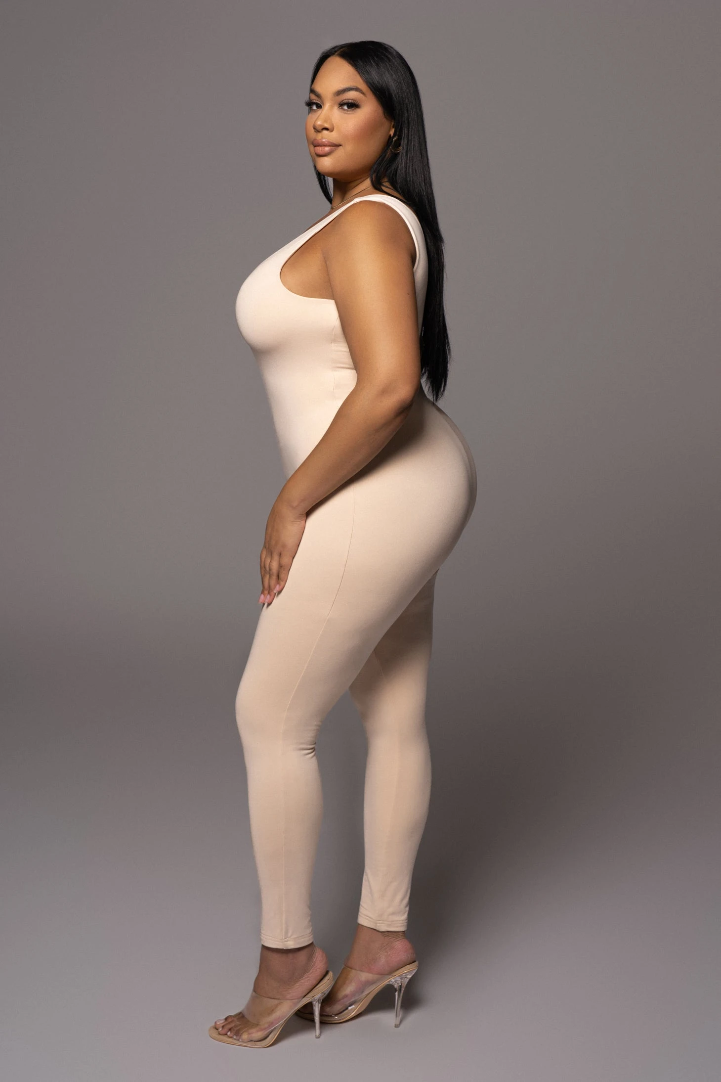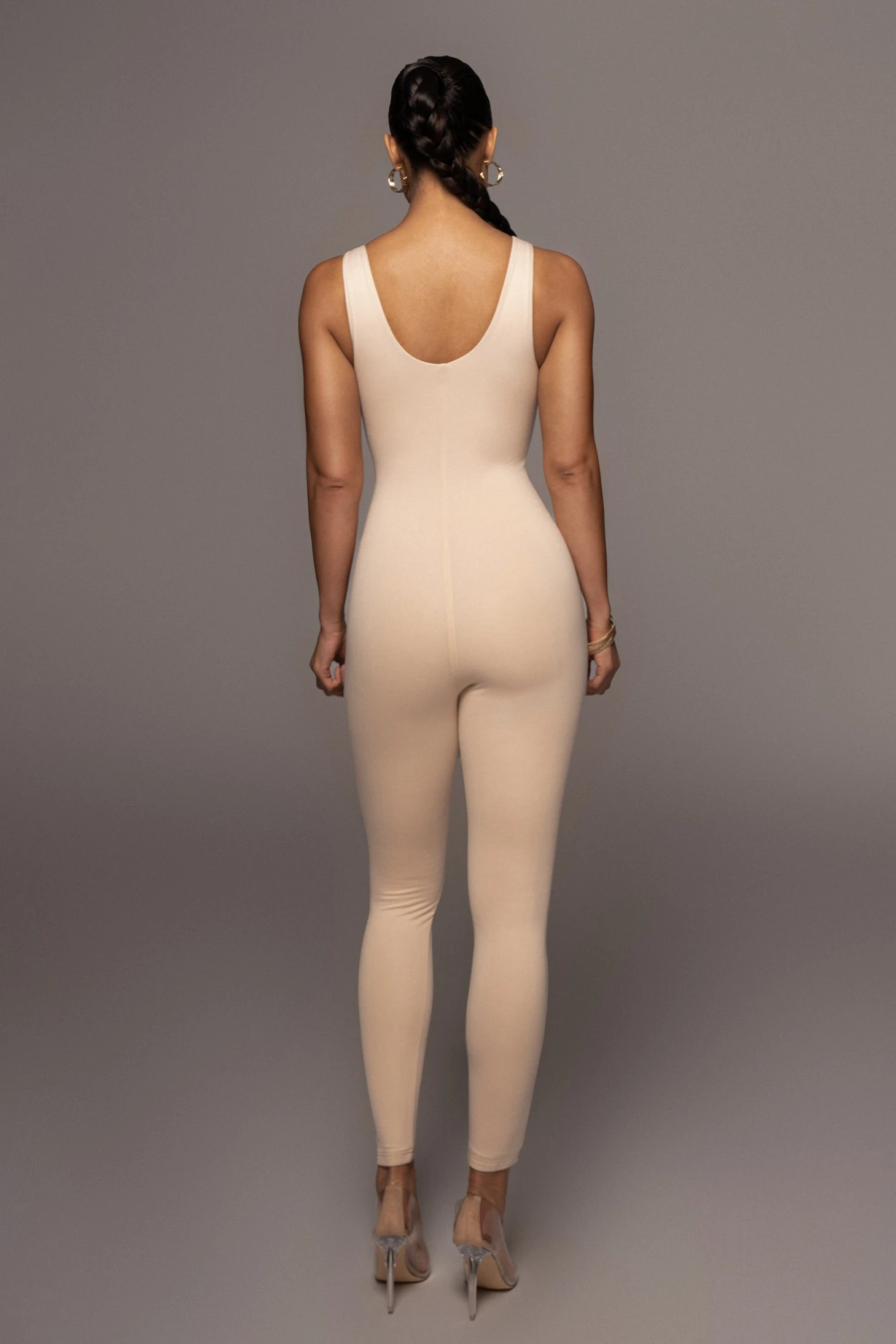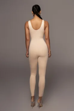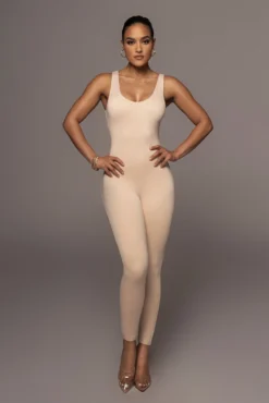 EXCLUSIVELY DESIGNED BY US FOR YOU. All eyes are on you when out in the CREAM ALO DOUBLE LAYER JUMPSUIT! This versatile, sleeveless jumpsuit features a body forming silhouette with a low scoop neck, tank shoulders, and skinny leg hems. Designed in smooth double lined jersey fabric for compression support. Style it as a layer or by itself, either way, your look will be irresistible! Stretchy.