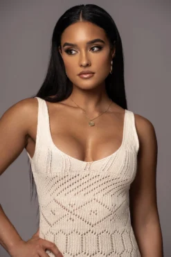 Look and feel your best this season in our Cream Ballari Crochet Knit Maxi Dress! Crafted in crochet knit fabric, this slightly see-through maxi dress features a v-neck with tank style shoulders and a stylish tassel trim hem. Single lined. Medium Stretch.