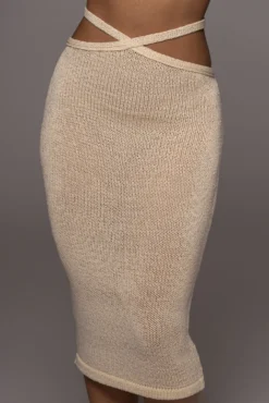 EXCLUSIVELY DESIGNED BY US FOR YOU. Your great escape awaits in our CREAM BEATRIX MIDI SKIRT. Designed in lightweight crochet, this modern skirt features a strappy tie waist with a midi length hem. Stretchy.
