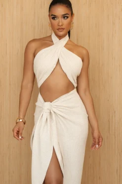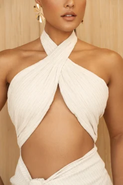Channel the goddess in you with our Cream Linen Sahara Dress. This appealing drape design features a crossover halter-neck with center cutout and a captivating side slit with wrap front ties draping down the middle. Designed in double lined linen fabric with a smocked back for a flexible fit. Some stretch.