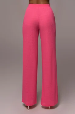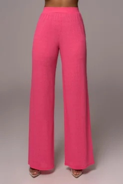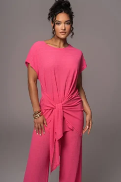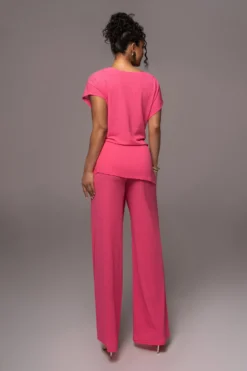 Our Fuchsia Chase The Sun Two-Piece Set is here to stay all summer! This stylish pant set features an oversized sleeve top with front wrap design. The matching pants come with an elastic waistband and classic straight legs for an instant day to night look. Stretchy. Single lined. Sold as set.