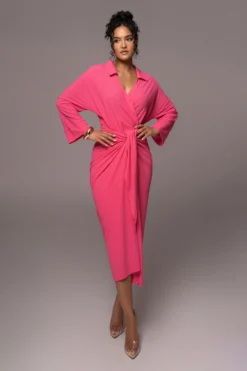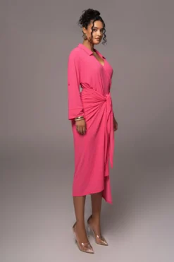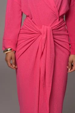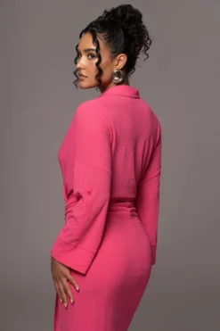 Take high summer style to the next level with our Fuchsia Sunlight Crinkled Skirt Set. This two piece set features a long sleeve top with surplice design, a collar neckline, and roll tab cuffs. The matching skirt features a wrap style design with midi length hem. Crafted of a breathable material, this summer set is the perfect cover up piece! Wear together or separate, the style possibilities are endless. Single lined with stretch. Sold as set.