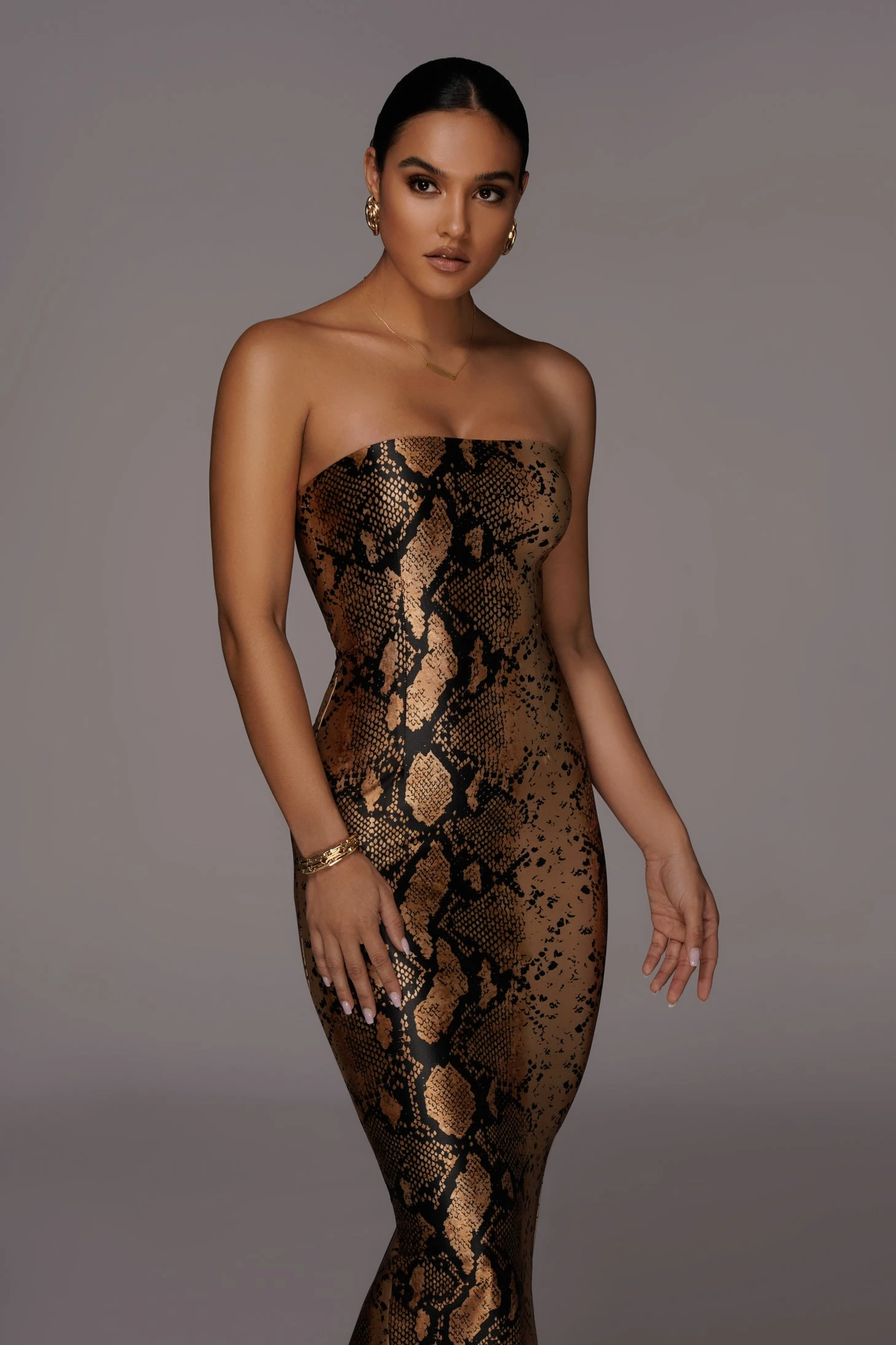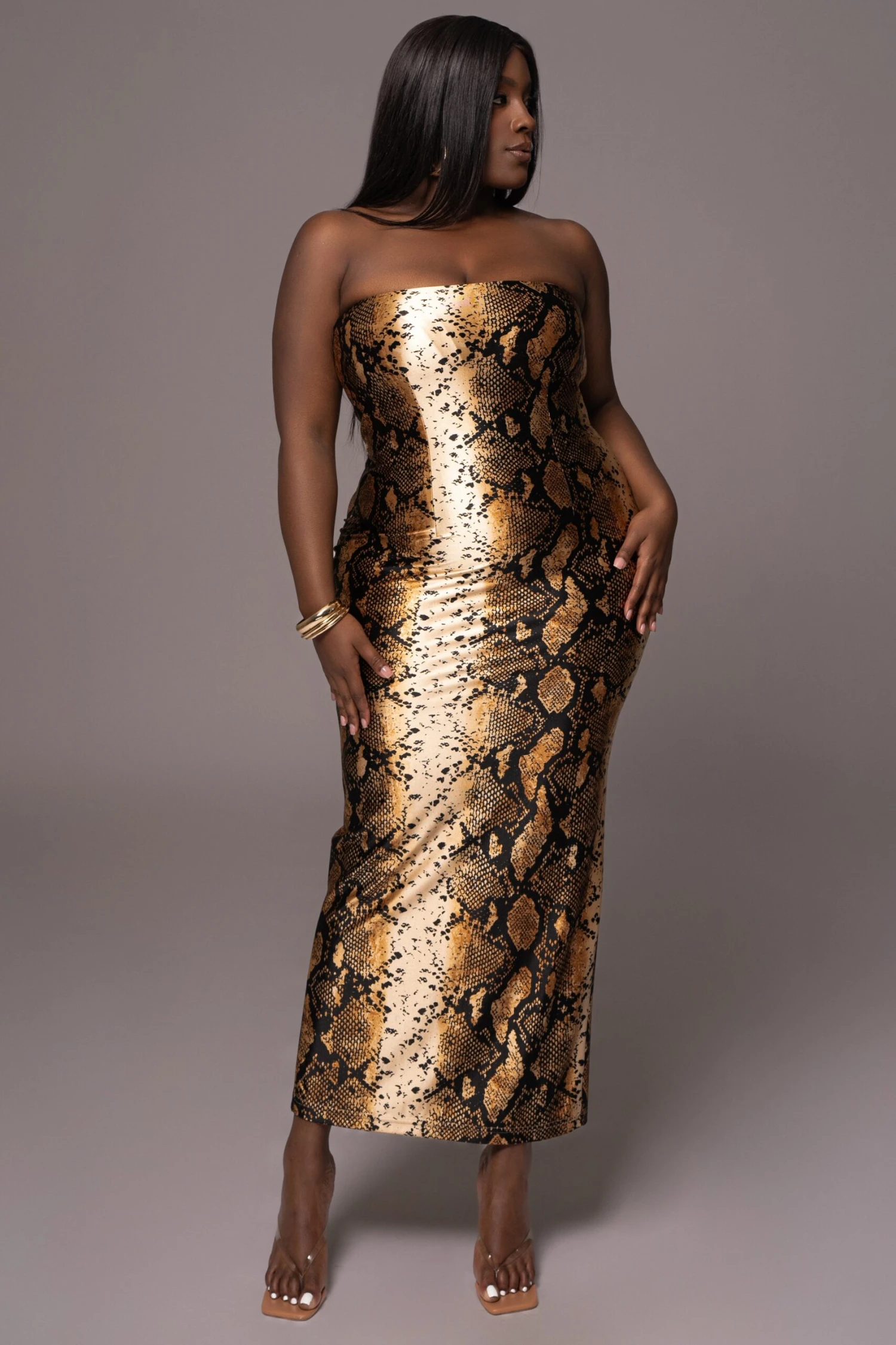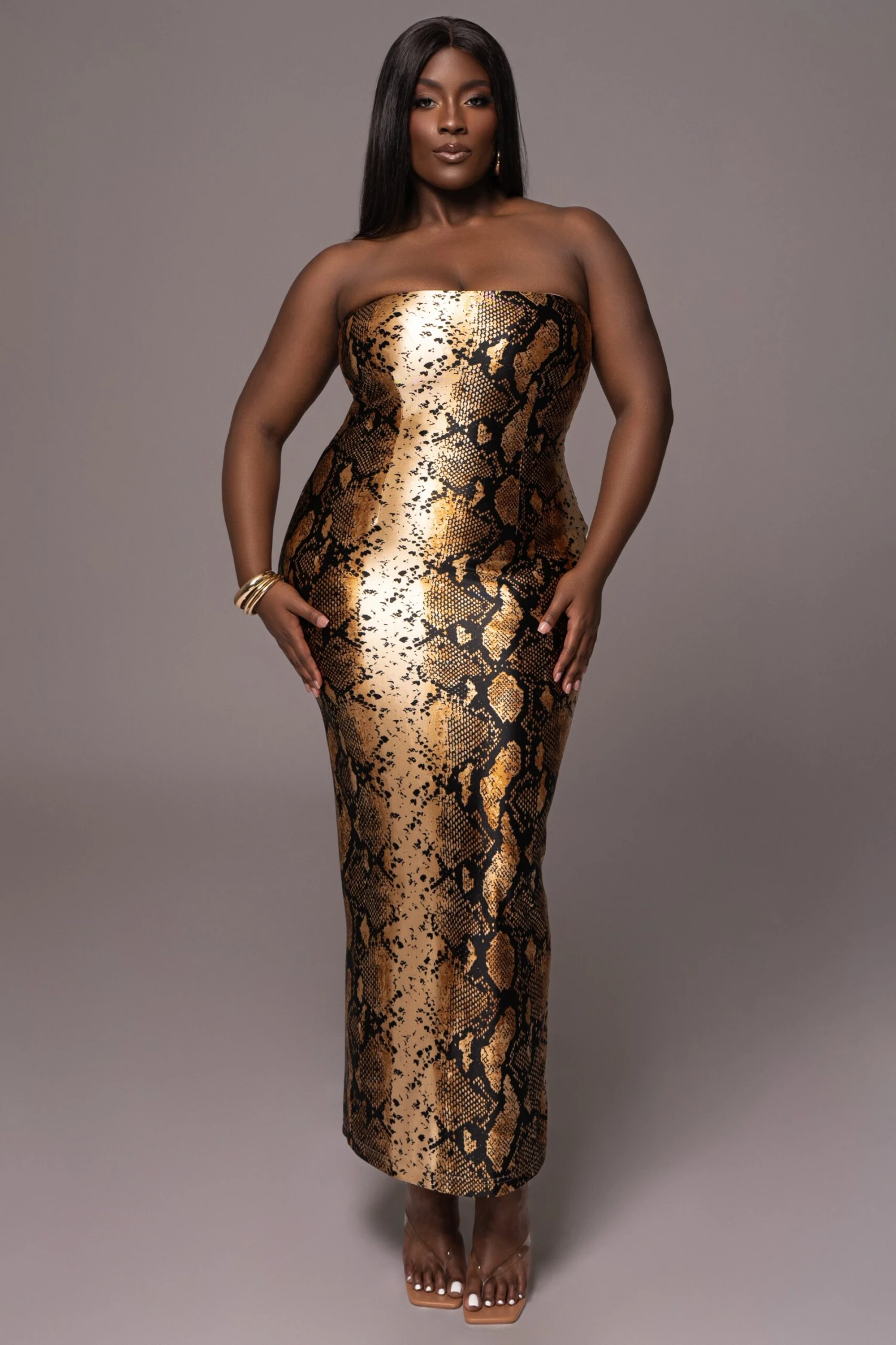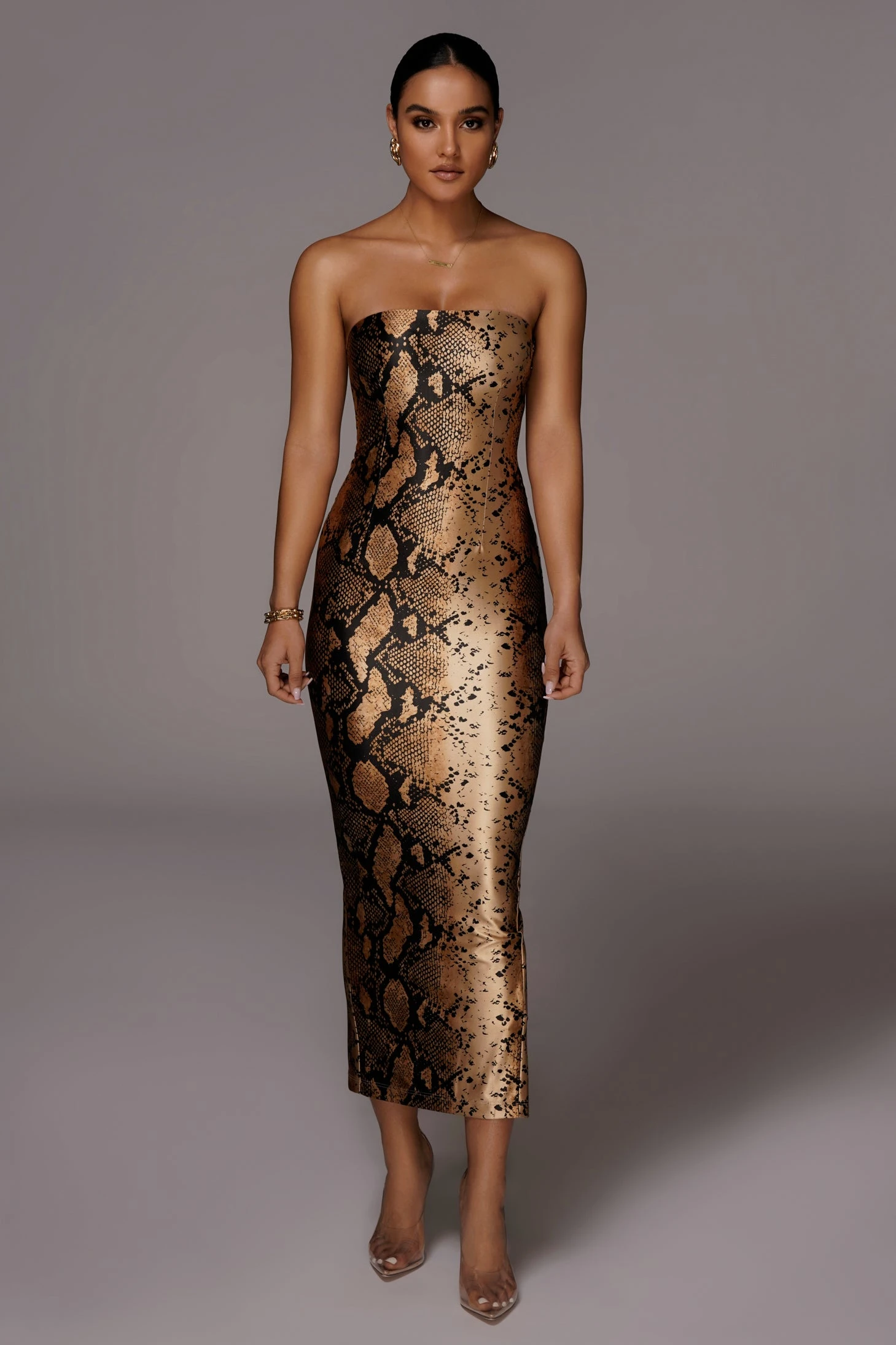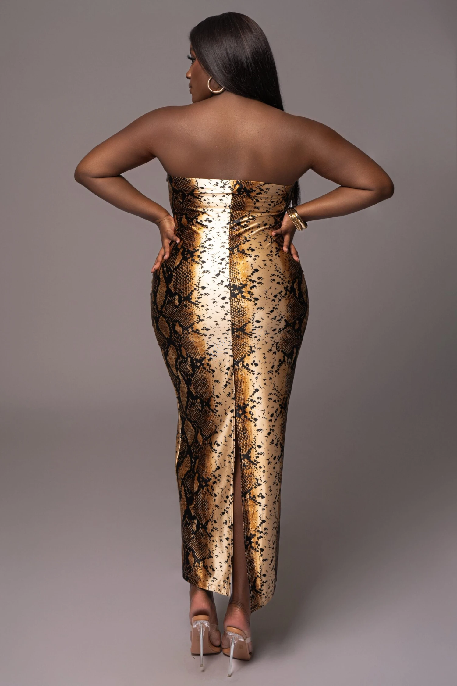 If you like the wild things in life, then the Gold Bianca Snakeskin Slit Dress is for you. This high shine midi dress radiates elegance in a sleek snake print with a strapless neckline and back slit hem. Crafted with a stretchy spandex fabric in a body-hugging silhouette. Complete with side zipper for closure.