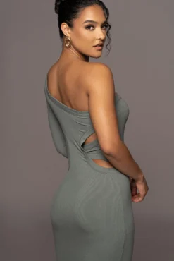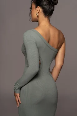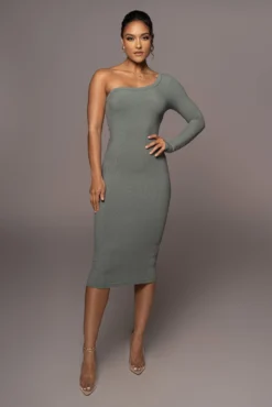 EXCLUSIVELY DESIGNED BY US FOR YOU. Theย GREEN VIXEN ONE SHOULDER DRESS is the perfect choice for your day to night occasions! This fully ribbed midi dress features a one-shoulder neckline with one long sleeve arm and a stylish back cutout to finish the look. Stretchy.