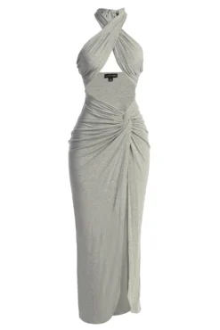 Channel the goddess within in our Grey Tamara Halter Midi Dress. Our newest addition boasts a captivating crossover halter design, complimented by a waist cutout and a striking side slit featuring a knotted detail for added flair. Expertly crafted from soft, double-lined fabric with stretch for a flexible fit. Stretchy. Double lined.