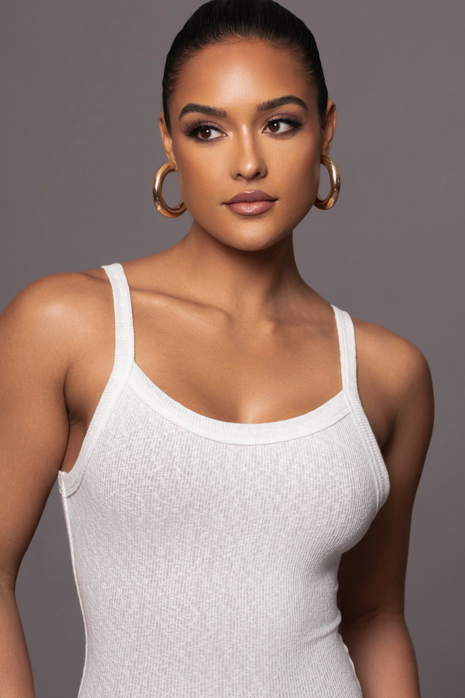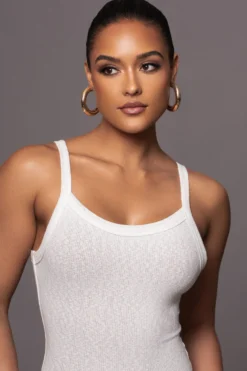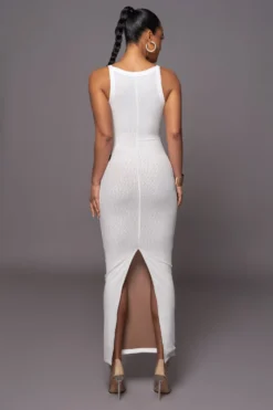 Our new Ivory Back To You Maxi Dress is a sleek and sophisticated garment that combines comfort and style. Featuring a U-neckline with fixed shoulder straps, back seam detail, and a maxi hem. A form-fitting silhouette accentuates your curves, while nude interior lining adds a smooth finish. Back slit hem. Stretchy.