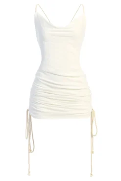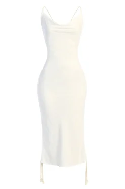 EXCLUSIVELY DESIGNED BY US FOR YOU. Get into a vacay state of mind with our IVORY BAHARI RUCHED LINEN DRESS. If you love our PHEOBE SLIP DRESS as much as we do, you’ll fall head over heels for our newest version in fresh linen fabric! This midi length dress highlights a cowl neckline with beautiful ruching along the sides and stylish rope shoulder straps leading to an adjustable back tie for the desired length. Designed in a Rayon/Linen blend for lightweight and relaxed comfort. No Stretch. Breathable.