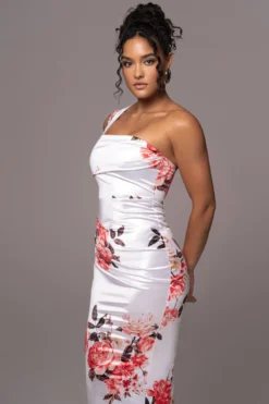 Our Crystalline Ivory Floral Midi Dress was hand-picked just for you! This midi dress showcases a one-shoulder neckline with a fitted silhouette and midi-length hem. Crafted in a satin-like material adorned with a dreamy and timeless floral pattern. Back zipper closure. Lined interior.