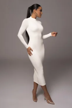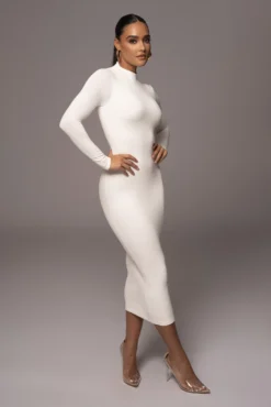 So sophisticated and chic in our new Ivory Shaye Mock Neck Dress. This body forming midi dress features a classic mock neck design with long sleeve arms and bares a flirty open-back with lace-up detailing. Crafted in our ultra soft double-lined fabrication achieving an effortlessly sculpted fit with ultimate appeal. Stretchy.