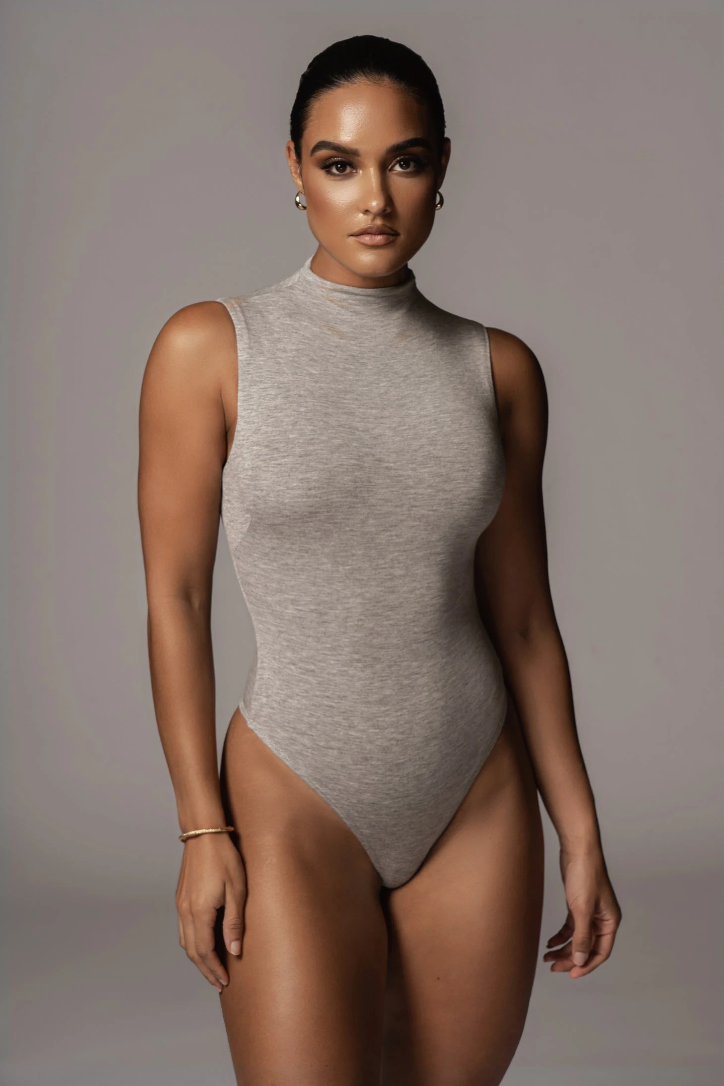 EXCLUSIVELY DESIGNED BY US FOR YOU. The must have transition piece has arrived. Our JLUXBASIX GREY CIELA HIGH NECK BODYSUIT is a chic ultra soft bodysuit constructed in our signature Jluxbasix double lined fabric and features a high neckline, sleeveless shoulders, and a thong bottom with snap button closure. This stunning bodysuit compliments and completes any outfit for a minimalist yet eye-catching look! Stretchy.