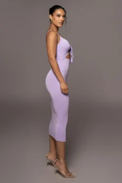 EXCLUSIVELY DESIGNED BY US FOR YOU. Stay on trend with our LILAC SOULMATE CUT OUT DRESS. Crafted in our signature double lined fabric, this comfy midi dress features a front cutout design with tie knot detail, adjustable shoulder straps, and a midi hem. Stretchy.