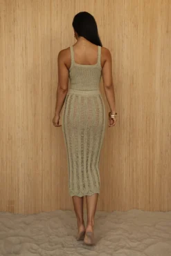 Luxuriate under the sun with our Moss Good Form Midi Skirt. This pencil silhouette midi skirt is featured in a distressed crochet fabric with an elastic waistband and beige lining interior. Pair with our