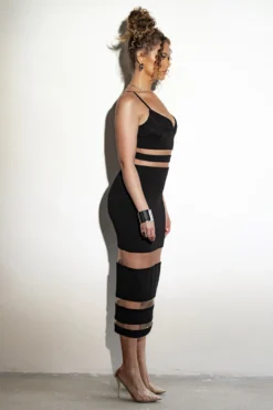 Meet our newest show-stopper, the Noir Alyshia Midi Dress. This modern midi dress features a bustier inspired chest with adjustable shoulder straps and a striped pattern of alluring mesh panels throughout. Crafted in our soft double-lined fabrication achieving an effortlessly sculpted fit with ultimate appeal. Hidden side zipper closure. Stretchy.