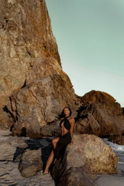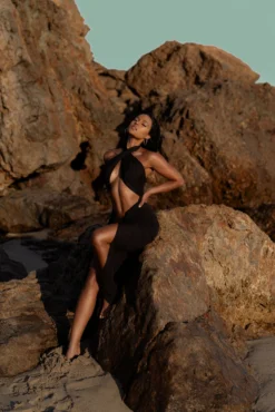 Channel the goddess in you with our Noir Sahara Dress. Back in all-new shades, this appealing drape design features a crossover halterneck with center cutout and a captivating side slit with wrap front ties draping down the middle. Designed in double lined fabric with a smocked back for a flexible fit. Some stretch.