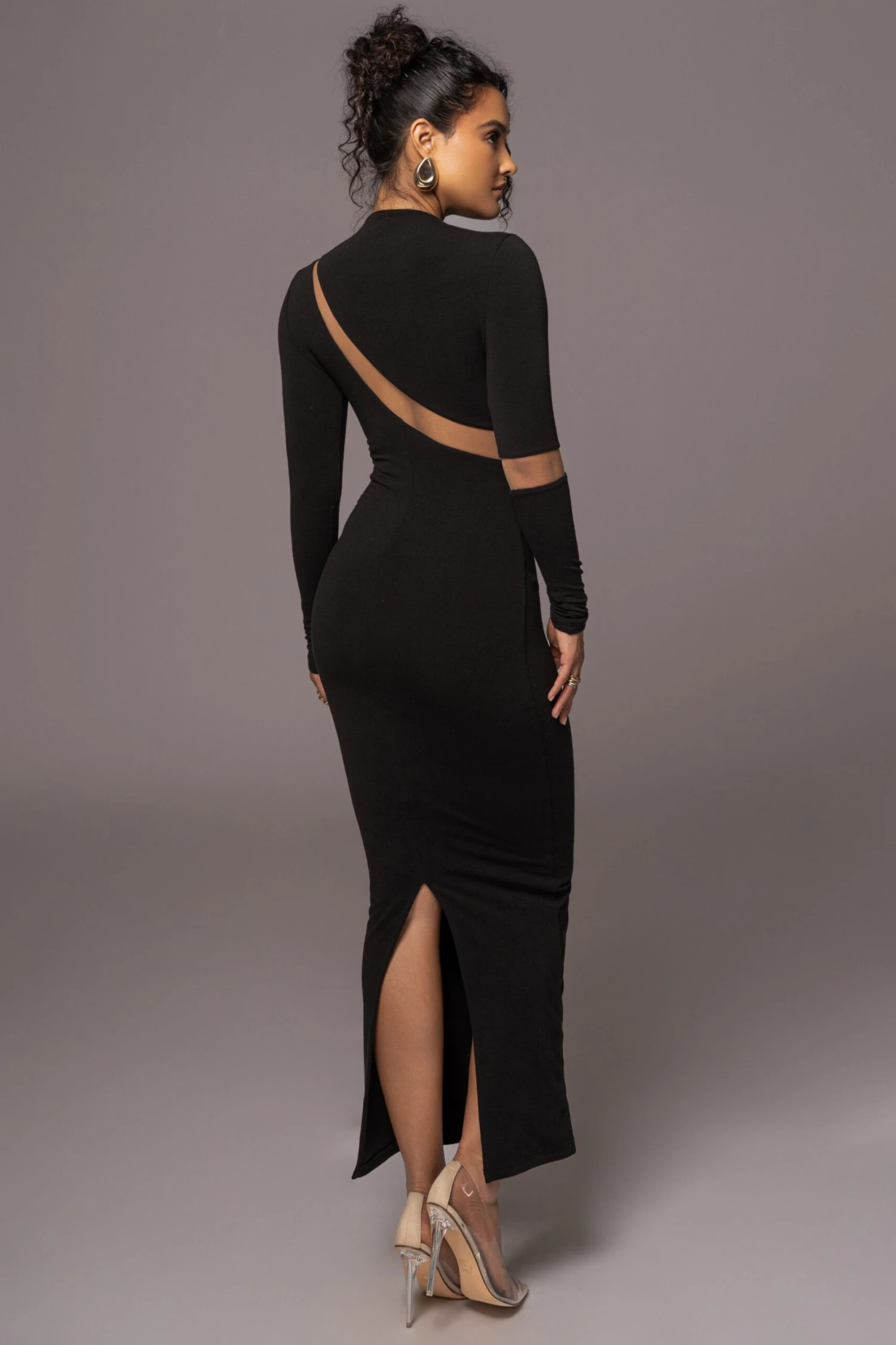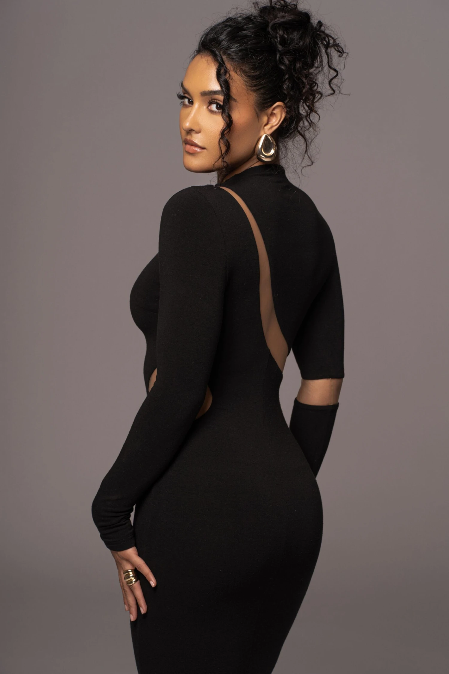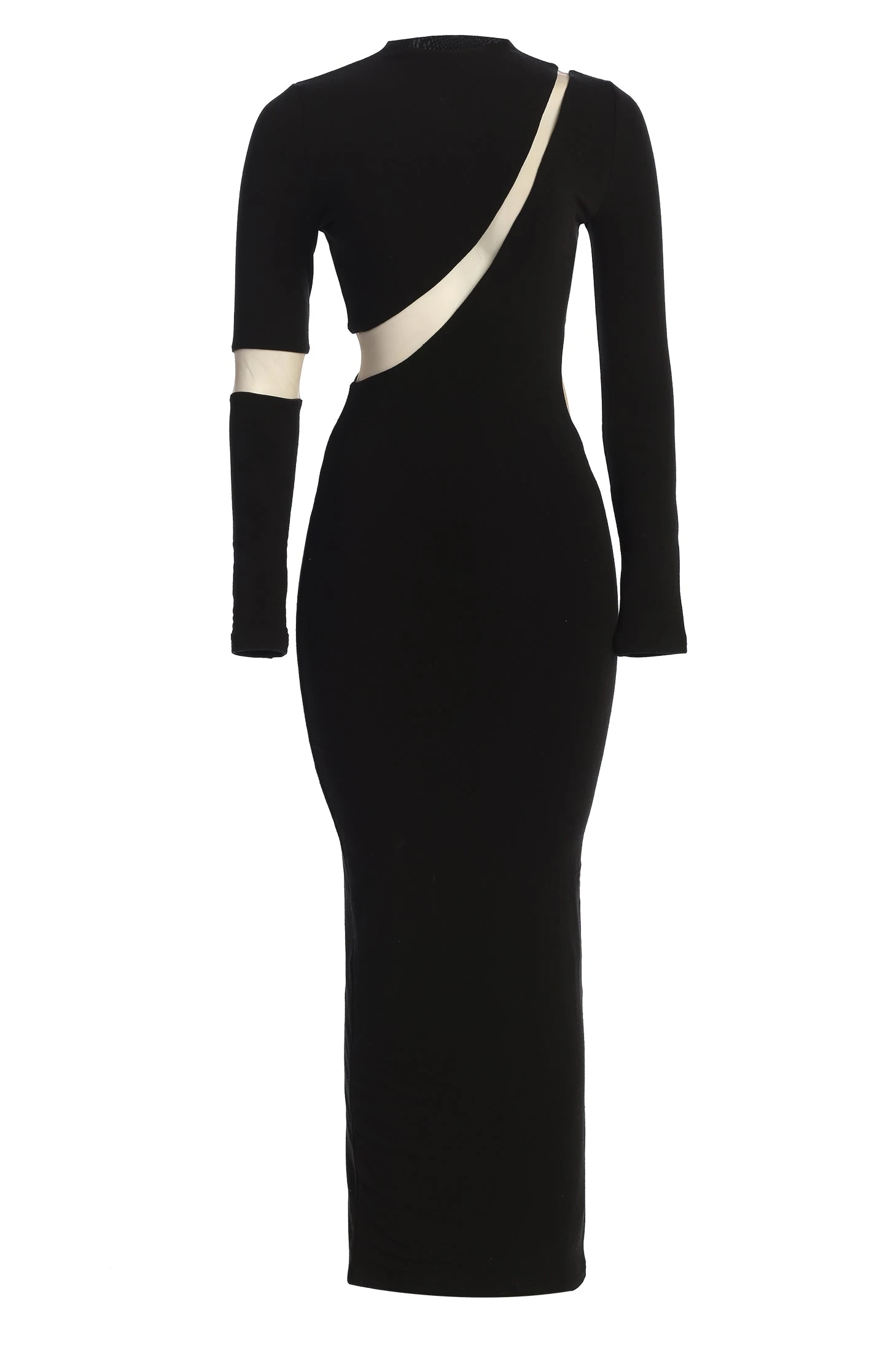 Captivate all season in the Noir Show Stopper High Neck Dress. Merging delicate mesh with smooth jersey, this long-sleeve midi dress showcases a mock neckline with a contemporary design of mesh panels starting from the left shoulder across the chest and down to the side waist. Stretchy. Double lined.