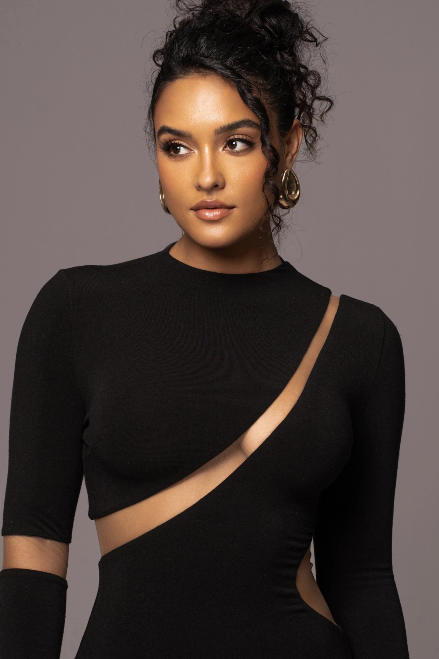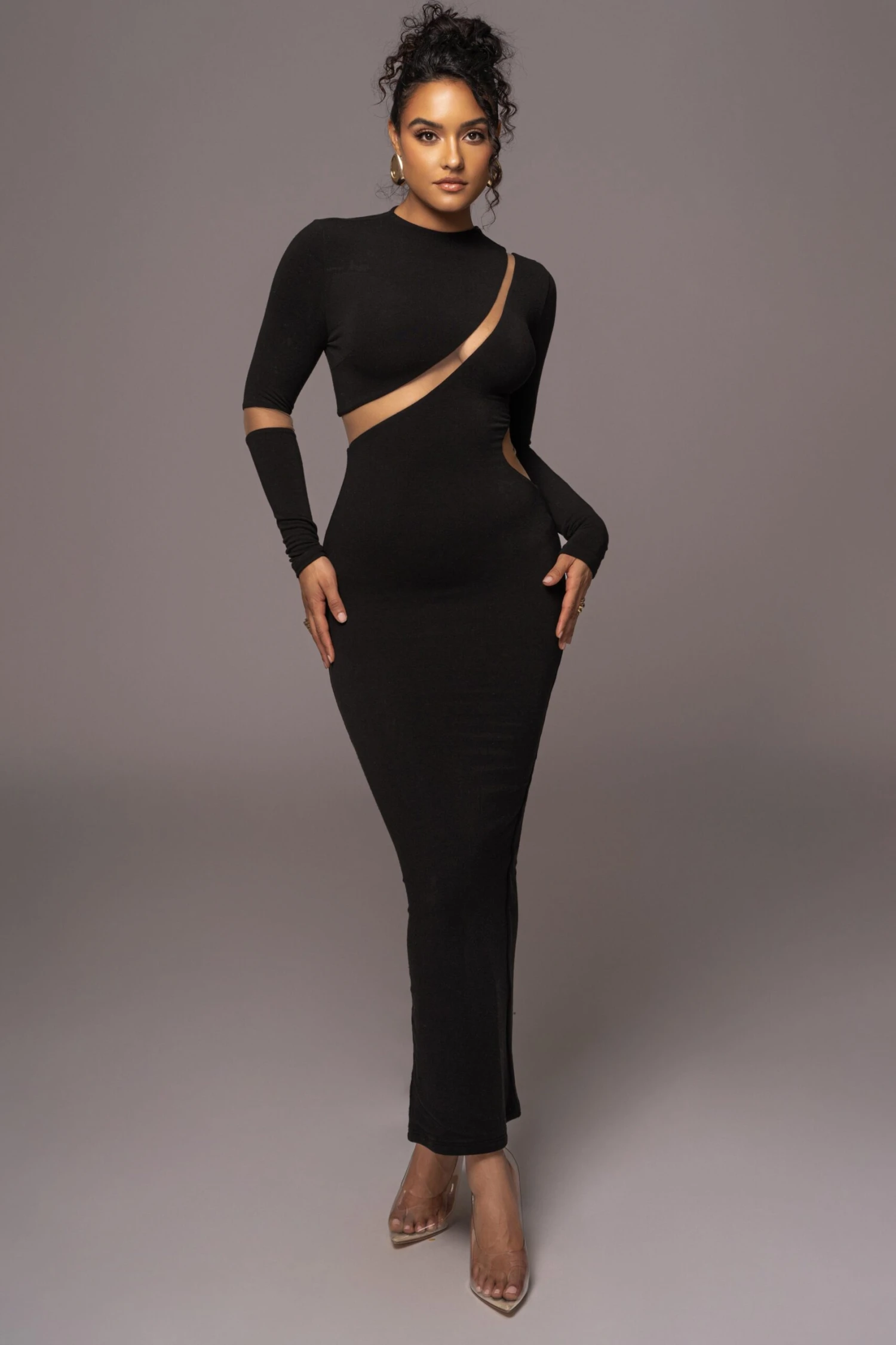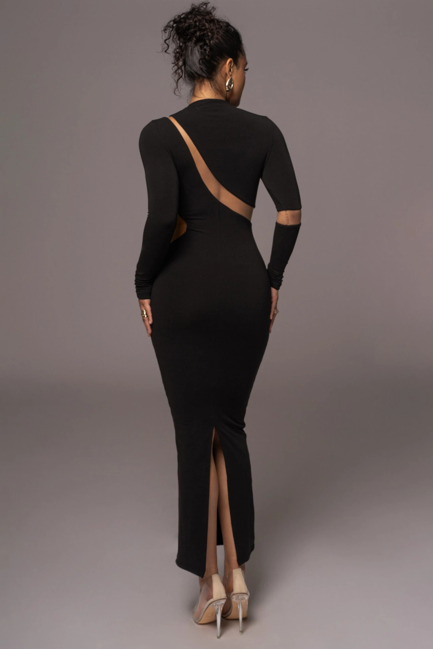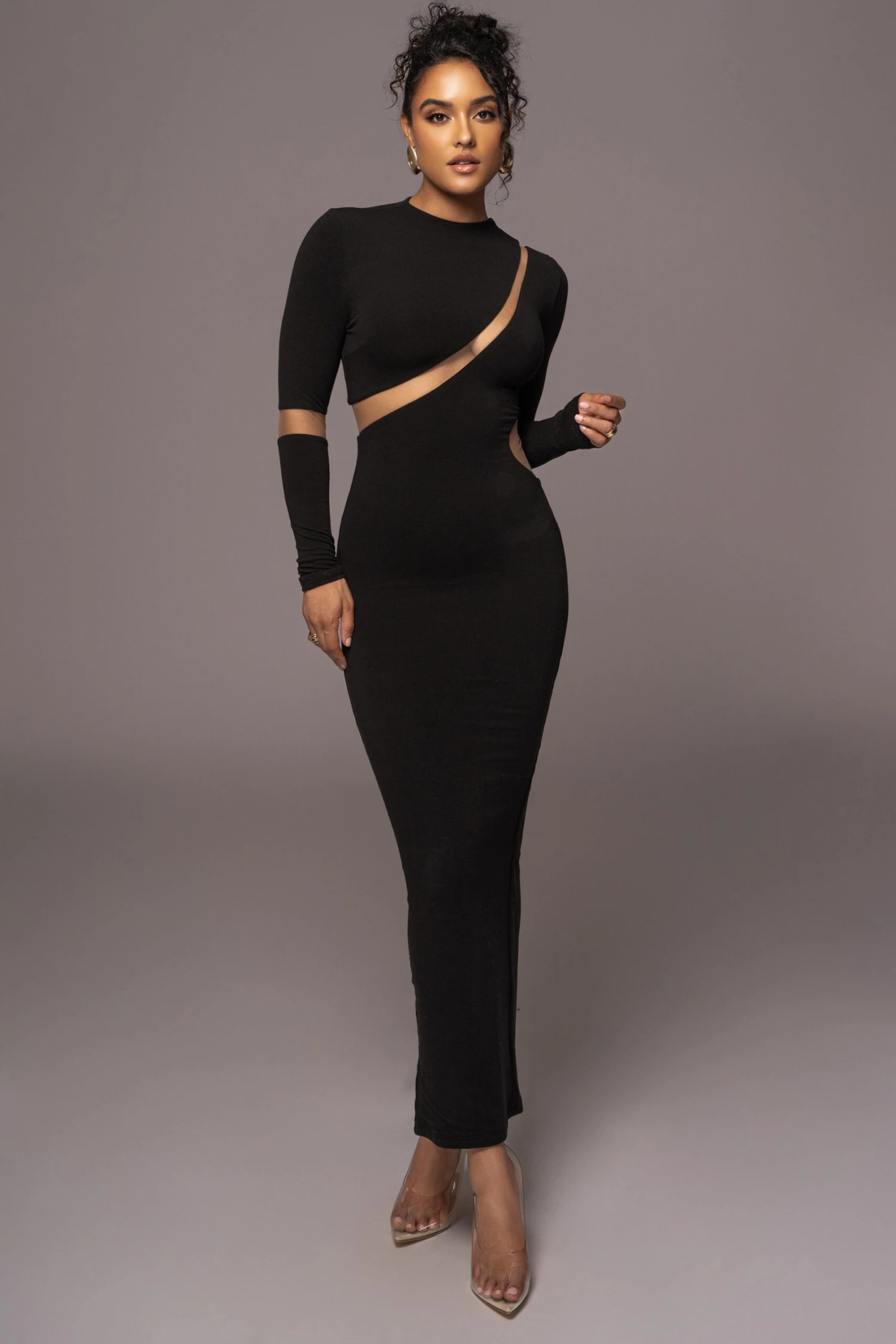 Captivate all season in the Noir Show Stopper High Neck Dress. Merging delicate mesh with smooth jersey, this long-sleeve midi dress showcases a mock neckline with a contemporary design of mesh panels starting from the left shoulder across the chest and down to the side waist. Stretchy. Double lined.