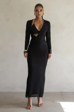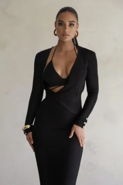 The set of your dreams is here with our Noir Zurie 3-Piece Skirt Set. This all-in-one skirt set features a delicate bikini-style top with an elastic band, neck ties, and back string tie closure. The matching skirt features a pencil silhouette with elastic waistband and a maxi-length hem. A breathable long-sleeve tops off the look for stylish coverage. Crafted of lightweight knit fabrication for transitional style. Stretchy. Sold as set.