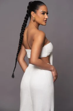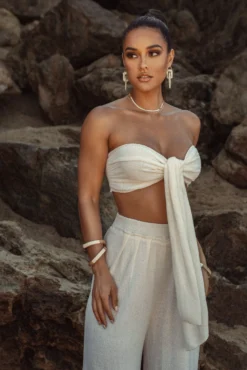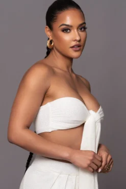 Giving you more of what you want, we’ve taken our best seller the Tory Two Piece Set and re-designed it in knit fabric for a textured element. The Off White Arya Two Piece Set provides stylish comfort featuring a stunning bandeau style top with tie front design. The matching pants come with a high waist and wide legs. Wear together or separate, this versatile two piece set can be effortlessly mixed and matched! Double-lined. Stretchy. Sold as set.