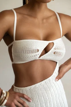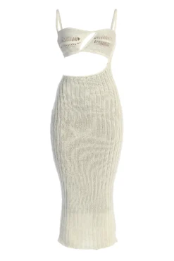 City meets coastal style in our new Off White Coastal Escape Dress. Crafted in a crochet knit fabric, this sleek midi dress features a square neckline with adjustable shoulder straps and two back straps with adjustable fastening. A cut at the chest and waist adds a touch of allure. Double lined. Stretchy.