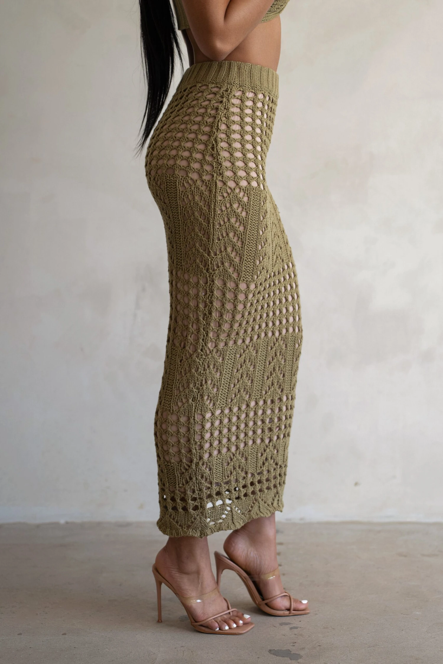 Embrace warmer days in the Olive Caribbean Skies Skirt Set. Crafted in a custom designed airy crochet material, our newest skirt set features a sweet crochet bandeau style top with tie front design and interior lining for coverage. The matching skirt features a pencil silhouette with scallop trim hem and nude interior lining for coverage. Elastic band. Stretchy. Sold as set. Double Lined.