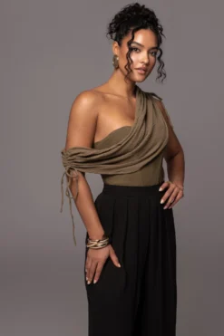 Live effortlessly elegant this summer in our Olive New Obsession Draped Top. Crafted from premium materials, this statement piece features a sweetheart neckline with one shoulder design detailing a graceful drape for an unmistakable touch of sophistication. The built-in corset and boning provide superior structure and a sensational fit. The draped piece is removable for 2 looks in one. Pair with our