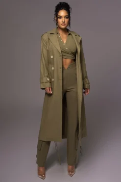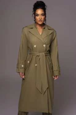 Start the day in style with our Olive One Step Closer Linen Coat. This sophisticated coat showcases a collared neck with notch lapels, two functional side pockets, and double-breast front closure with a matching waist-belt to hold it all together! Button tab embellishments at the cuffs and shoulders add an extra touch of refinement. Some stretch. Lined interior.