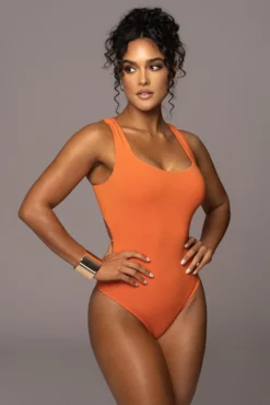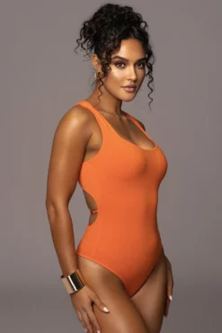 Smooth to the touch in theĀ Orange Brianne Cutout Bodysuit. Featured in a soft double-lined fabrication with a scoop neckline, tank shoulders, and a open backĀ detailing anĀ adjustable waist strap for an extra cinched fit. Thong-back bottom with double snap closures. Stretchy.