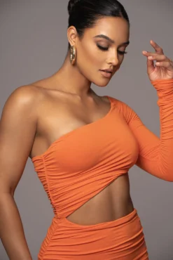 Our new Orange Light Up The Night Dress is the true definition of versatile luxury. This sweet do-it midi dress features a fitted, one-shoulder neckline design with a cutout at the waist and a stylish asymmetric cut hem. Flattering ruching throughout adds stylish dimension. Stretchy. Double lined.