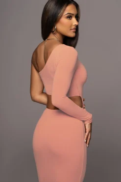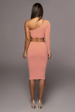 Whatever the occasion our Peach Yours Truly Midi Dress is always the right pick! Designed in our ultra smooth gummi fabric, this stylish bodycon dress features a one shoulder neckline with an alluring back cutout at the waist and a midi hem. Stretchy.