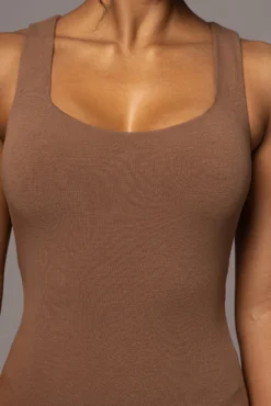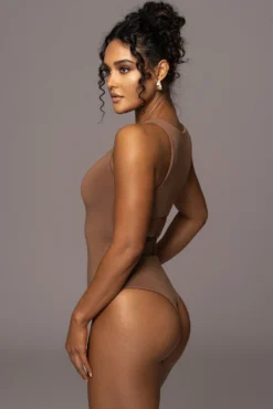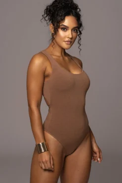 Smooth to the touch in the Pecan Brianne Cutout Bodysuit. Featured in a soft double-lined fabrication with a scoop neckline, tank shoulders, and a open back detailing an adjustable waist strap for an extra cinched fit. Thong-back bottom with double snap closures. Stretchy.