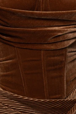 EXCLUSIVELY DESIGNED BY US FOR YOU. Make a statement this season in our PECAN DREAM MAKER CORSET. Made of a velvet blend, stand out in this charming corset style top featuring a strapless neckline with a draped design and padded cups for support. The bodice is structured with boning detail throughout and is cropped with a curved hem. Complete with a back zipper for closure and silicone grip at the bust for a secure hold. Stretchy. Fully lined.