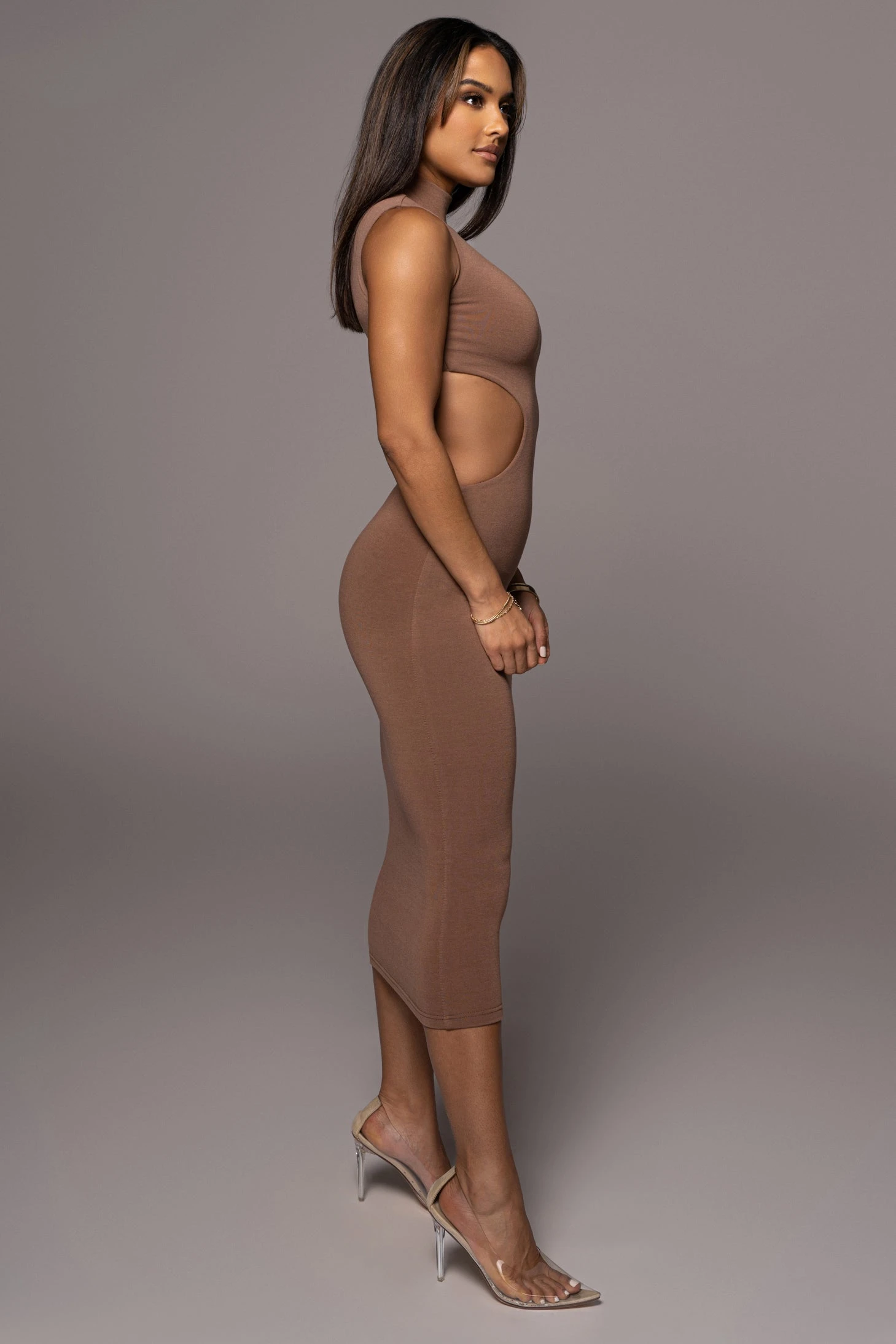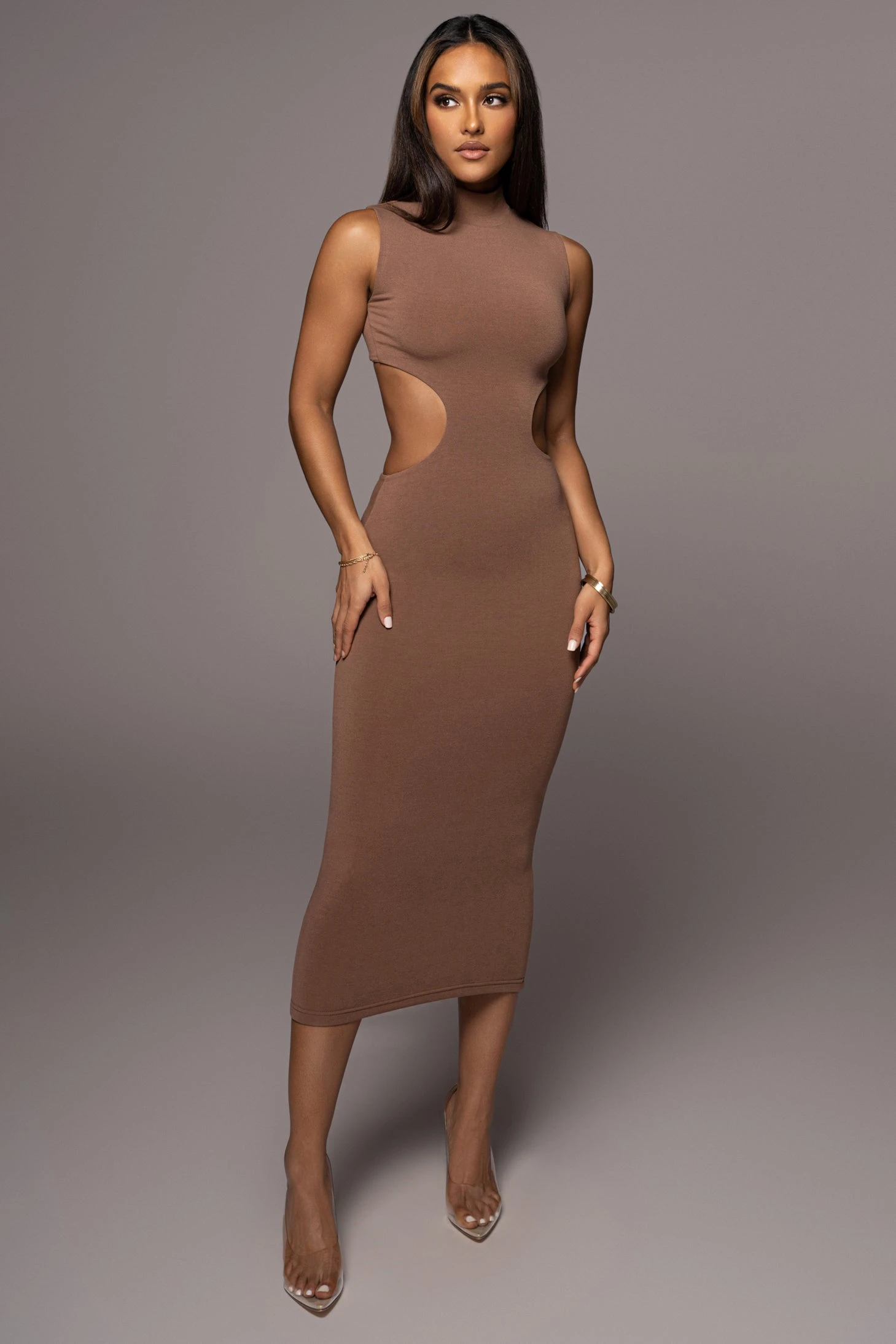 Forever mesmerizing in our Pecan Til Sunrise Midi Dress. This beautiful midi dress highlights a mock neckline with sleeveless shoulders and a seductive cutout at the waist. Double lined. Stretchy.