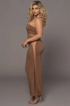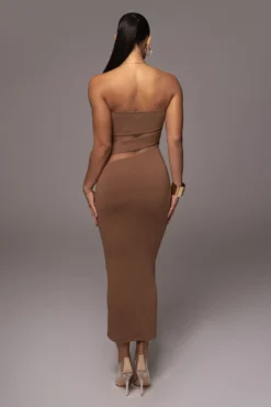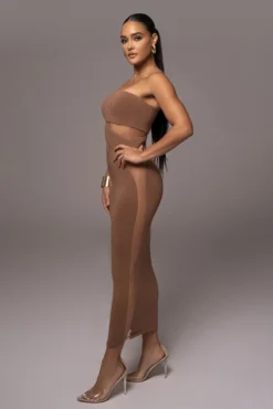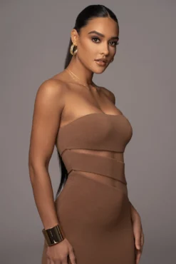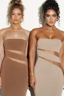 Bring sheer elegance to your next special occasion in our new Pecan Unpredictable Dress. This fitted midi-dress features a strapless neckline with alluring sheer panels in asymmetric patterns creating the illusion of stylish cutouts. Crafted in our double-lined fabrication achieving an effortlessly sculpted fit with ultimate appeal. Stretchy.