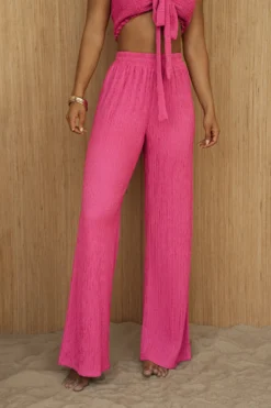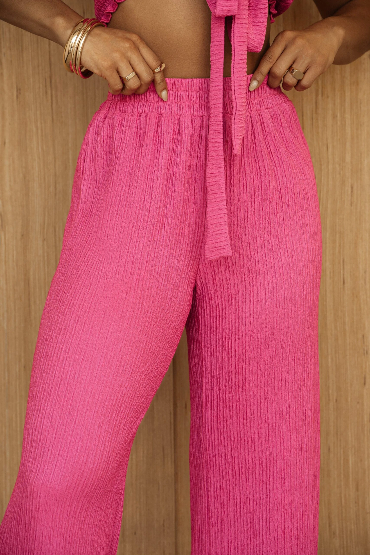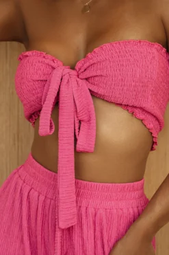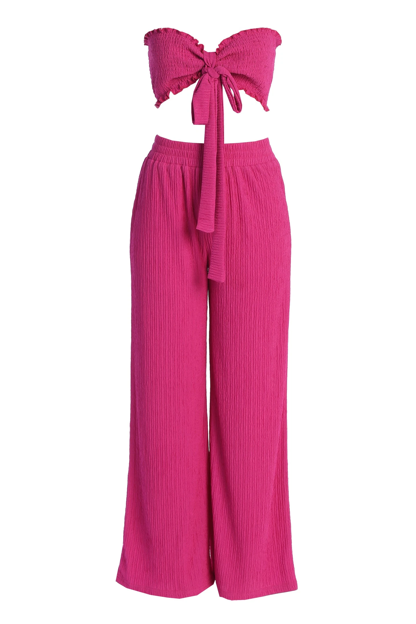 Say hello to the perfect summer set, the Pink Odessa Smocked Pant Set. This satin pant set features a fully smocked tie front bandeau top providing flexible stretch. The matching bottoms features a smocked waistband with straight leg hems. Stretchy. Sold as set.