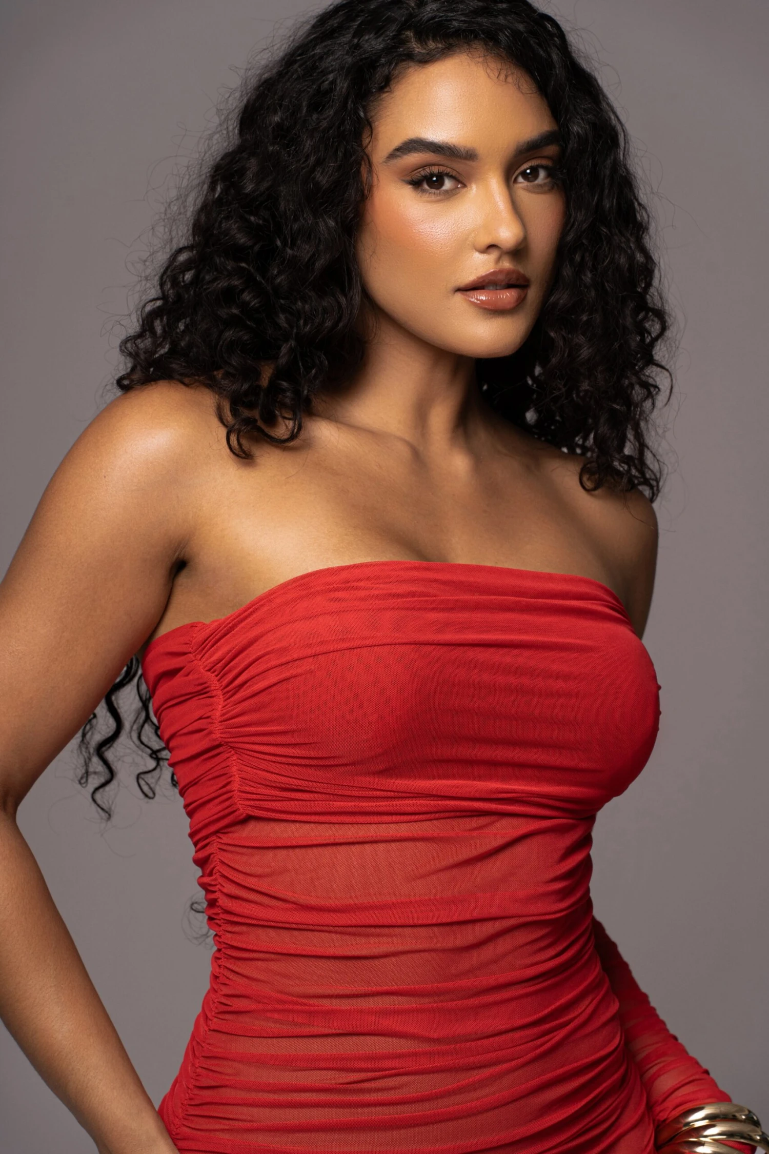 Our Red Denise Ruched Dress is mesh perfection! This modern midi dress features a one shoulder neckline with full arm coverage, a padded bust, and beautiful ruching detail throughout. A curve-hugging silhouette and stylish back slit finish the look! Complete with nude interior lining. Stretchy.