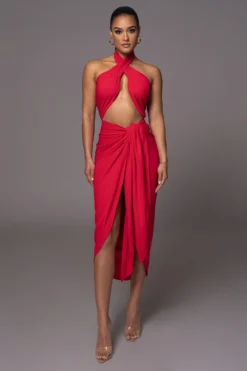 Channel the goddess in you with our Red Sahara Dress. Back in all-new shades, this appealing drape design features a crossover halterneck with center cutout and a captivating side slit with wrap front ties draping down the middle. Designed in double lined fabric with a smocked back for a flexible fit. Some stretch.