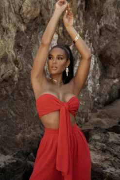 Giving you more of what you want, we’ve taken our best seller the Tory Two Piece Set and re-designed it in knit fabric for a textured element. The Scarlet Arya Two Piece Set provides stylish comfort featuring a stunning bandeau style top with tie front design. The matching pants come with a high waist and wide legs. Wear together or separate, this versatile two piece set can be effortlessly mixed and matched! Double-lined. Stretchy. Sold as set.